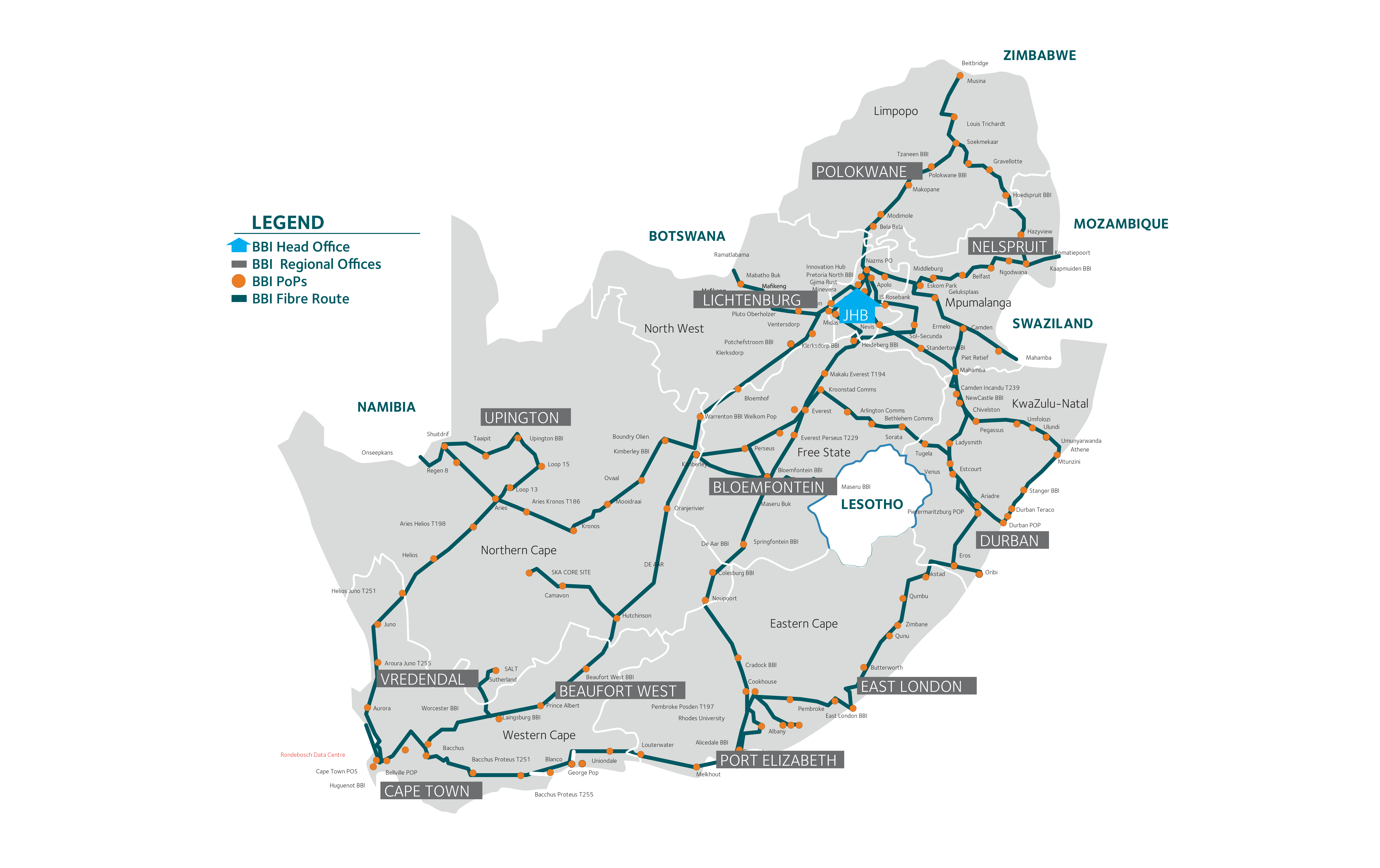 Broadband Infraco can link the submarine cable landing of WACS on the West Coast and Eassy and Seacom on the East Coast through its terrestrial national network.